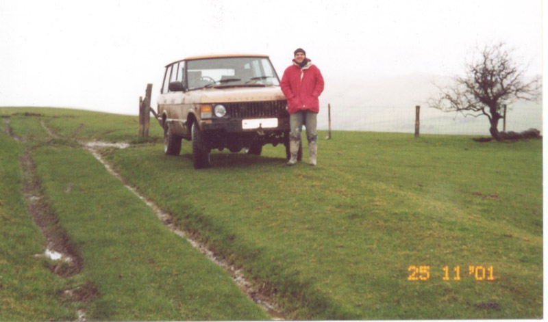 Although it was still gently raining and there was a cold wind we were in much better spirits than the night before. We proceeded down the lane crossing a stream then climbing up the other side. I noticed that the “fuel” light keeps flashing on and wondered if we had enough petrol to get us to a petrol station. The track was a bit bumpy but fairly good until we came to a section where the lane had subsided. This section was made of railway sleepers wired together and I got out to guide Carl through, as we didn’t want to slip off the track and find ourselves in the same predicament as the day before. Up ahead we could see another Range Rover accompanied by a couple of SWB Series motors. By now the “fuel” light was becoming quite insistent and I was beginning to doubt whether or not we would make it to a garage. Halfway down the lane was a monument to a local explorer and it was here that we caught up with the group in front. We stopped to sign the visitors’ book and have a chat with them. They were from the North Wales 4×4 whom I had contacted when planning the trip and they knew Steve Charles who had been so helpful when we were planning the route. We asked about the prospect of a petrol station and they said there might be one in Bala, but they couldn’t guarantee it would be open as it was Sunday and in Wales. They offered to let us go in front and said they would follow us in case we broke down. We set off again but now in a convoy of 4. I was concerned that even though we might make it to Bala we might find the petrol station shut. So we pressed on a bit faster than the others in the certain knowledge that, should we run out of petrol, they were there behind us.