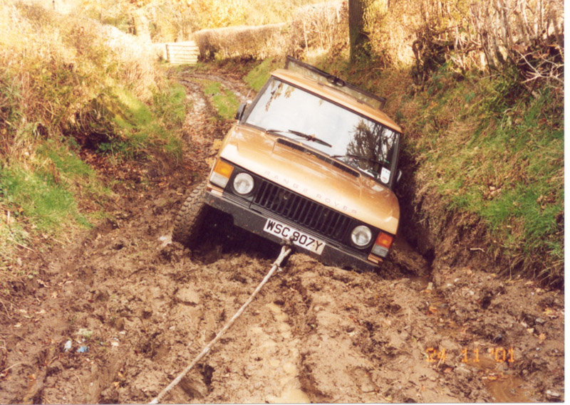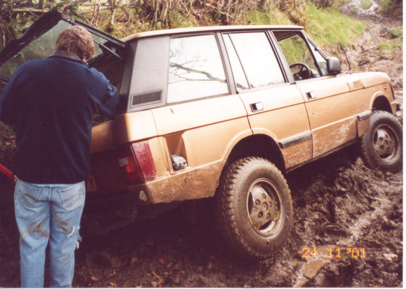 What appeared to be a depression on one side of the lane turned out to be a very deep hole filled with soft slimy silt. As we were trying to slowly crawl round the side the Range Rover slid unceremoniously into the mire. Attempts to back up only resulted in it digging in even deeper. We were now well and truly stuck, the time was 1:30 in the afternoon. We were on our own and don’t have a winch, all we had were ropes, tree strops, a chain, spades and the Hi-lift jack. We tried to Hi-lift the back of Range Rover up and push it over but we couldn’t get it high enough as the jack kept sinking in, even with a spreader. When I stepped behind the car to open the tailgate I sank into the mud until it was above my crutch.