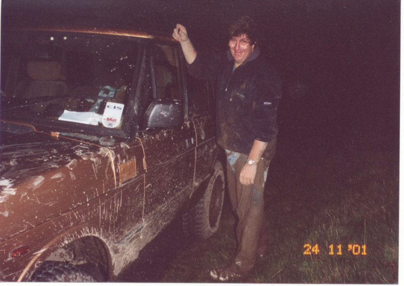 After a good deal of deliberation and several abortive attempts at extraction we decided our only option was to use the Hi-lift as a winch. It took about 4 and a half hours before we were free and by now it was dark, cold and raining. We decided to press on to the last lane of the day “Wayfarers Way”. We made our way to Llanarmon Dyffryn Ceiriog without incident, but as we proceeded up the Afon Ceiriog valley disaster struck, a puncture. Now in normal circumstances this would not present a problem, but right now was not a good time. The rain had now turned to sleet, it was cold and windy, I was soaked through and I had to crawl under the car with a bottle jack in pitch black with the mud slowly dripping down my neck etc. At this point our spirits were at a very low ebb. After changing the wheel we decided to call it a day and returned to farm completely exhausted. We arrived back at the farm cold, wet and thoroughly dejected. As we got out of the Rangie we bumped into Nick who said “don’t let mum see you like that or she won’t let you back in the house”.