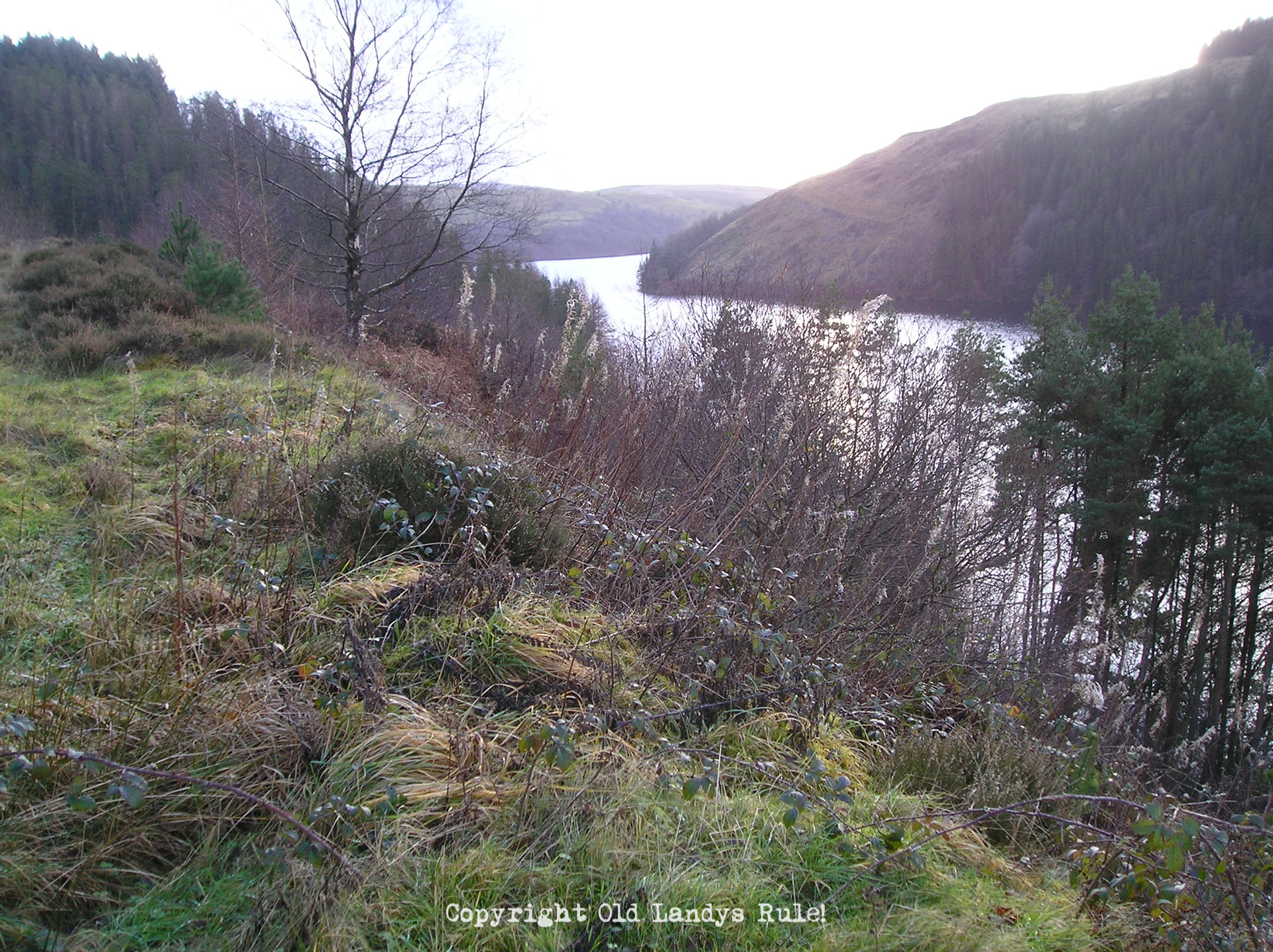 Next morning we awoke to a grey day, a slow drizzle was coming down and it was quite cold. After a cooked breakfast we had a consultation with Andrew in the main farm house where they have OS maps of the surrounding area with all the lanes clearly marked. One of the advantages of Llanchindda farm is their knowledge of the current state of the surrounding lanes and their drive-ability. We decided to tackle Strata Florida and set off with me, David and Jamie in my Discovery in the lead and Phil and “Herbert” in the V8. We drive up the steep hill from the farm and follow the road until we reach the gate of the first lane where we turn right off tarmac and proceed down a steep but well maintained lane to the road below. From here we proceed to the Llyn Bryne Reservoir and beyond, stopping occasionally to take pictures of the reservoir.